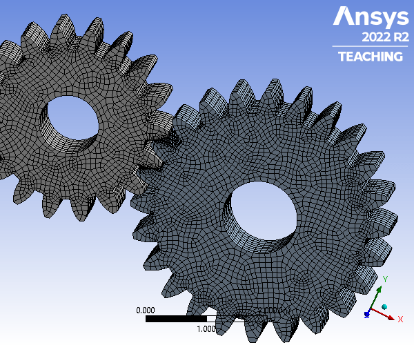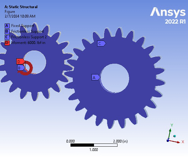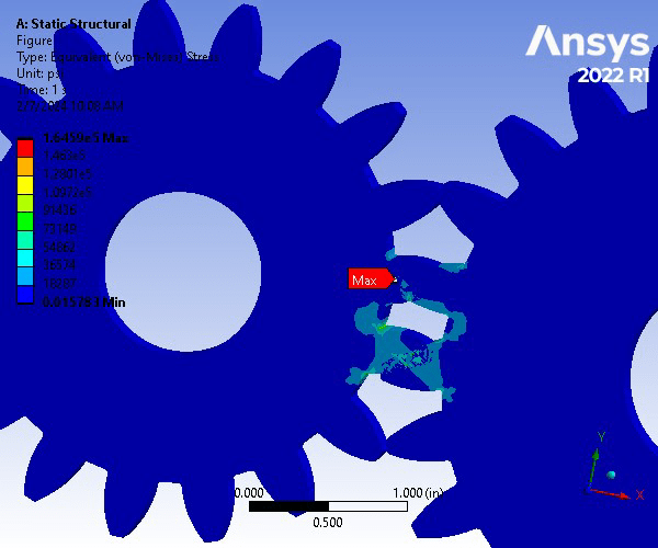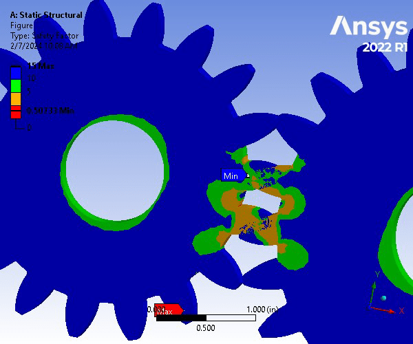 A gear set consisting of a pinion and spur gear is constructed of Structural Steel. The gear set underwent a Static Structural Analysis on ANSYS to determine the strength of the gear teeth. For an accurate analysis, the contact region between the two was set to be frictionless to allow for the movement and meshing between the gear teeth. The two bodies were assigned a 0.1 in mesh size. To focus on the where the teeth will be meshing, an edge size refinement was assigned that created 40 divisions along the specified edges. Next, the spur gear was assigned a fixed support on the inner face of the gear, whereas the pinion gear was assigned a frictionless support on its inner face. Next, a frictionless support was assigned to the front and back faces of both gears. Finally, a moment of -6000 lbf was applied in the z-direction of the inner surfaces of the pinion gear. The resulting factor of safety for a million cycles was 0.507 and is therefore an unsafe design.