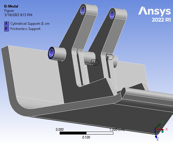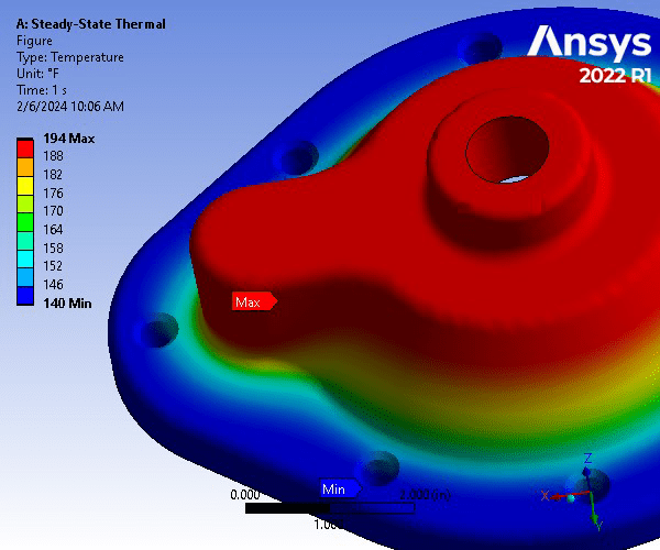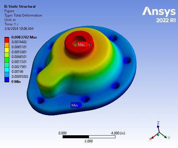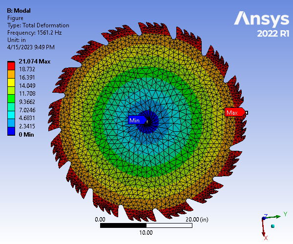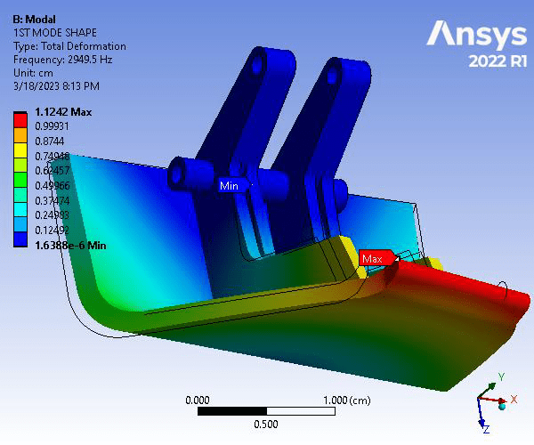 Due to the nature of the part’s usage and loading, a modal analysis. A total of 8 modes were simulated. At the 8th mode (21017 Hz), the part underwent significant deformations than can be observed from both the provided figure as well as the simulated animation. It is obvious that the deformations resulting from the differing frequencies, under the same constraints as the static structural analysis, were more severe than that shown in the total deformation plot. Hence, it is important to analyze parts like this both by static structural and modal analyses.