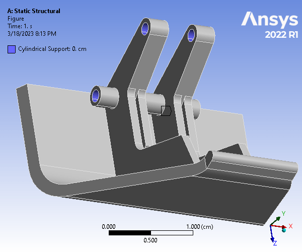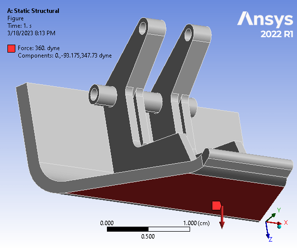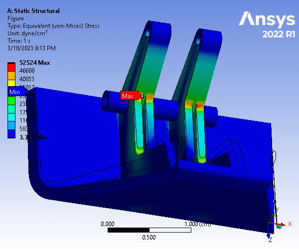 The given hood latch was modeled on Creo and simulated using ANSYS Static Structural and Modal analyses. The part was analyzed using a 0.04cm mesh size, and a mesh refinement was applied to 6 rounded surfaces. To constrain the model, cylindrical supports were assigned to all cylindrical surfaces, and a fixed support was applied to the two outer surfaces of the bottom cylindrical hole. Finally, a 360 dyne force loading was applied to the large outer surface, normal to and coming out of the geometry. For the analysis, Weak Springs (program controlled) were utilized.