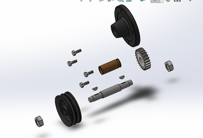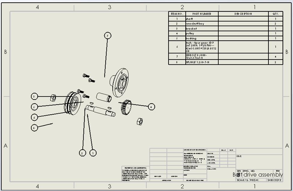 which can be pulled from the SolidWorks design library. The base of the entire assembly is the solid shaft which was easily created with circular sketches extruded to the specified dimensions. Using ANSI standards for keyset dimensions for woodruff keys, the keyseats were cut from the shaft (one cut, mirrored about the symmetric plane) in order to fit the appropriate woodruff key (#1008). Similar to the shaft, the woodruff key was first a circular sketch, extruded to the appropriate width. The remaining created parts are designed to be around the shaft and therefore have circular holes through the center. This, along with the section assembly drawing given, suggested that the best way to create these parts were to sketch them with respect to half of the section view and revolve the sketch about the main assembly axis. Any holes needed can be cut after the revolved extrude. The holes on the bracket were made to fit the specified hex bolts using the Hole Wizard* tool—one hole was made and then used as the base for the circular pattern about the center axis, creating 4 holes in total. This same technique of circular patterns was used to assemble and mate the hex bolts to the holes. The spur gear from the design library was configured to the appropriate specifications; changes were made using the equations and relations. Finally, the hex jam nut was added at the end of the assembly from the design library, and it was also configured to the drawing specifications. In the assembly, one nut was added and mated and the second was a mirror of the first. From the assembly drawing given, it’s clear that the assembly and corresponding mates are fitted well, consisting of faces being coincident with each other. Additionally, all the components, save for the woodruff keys, are centered around the same axis, creating a relatively easy assembly