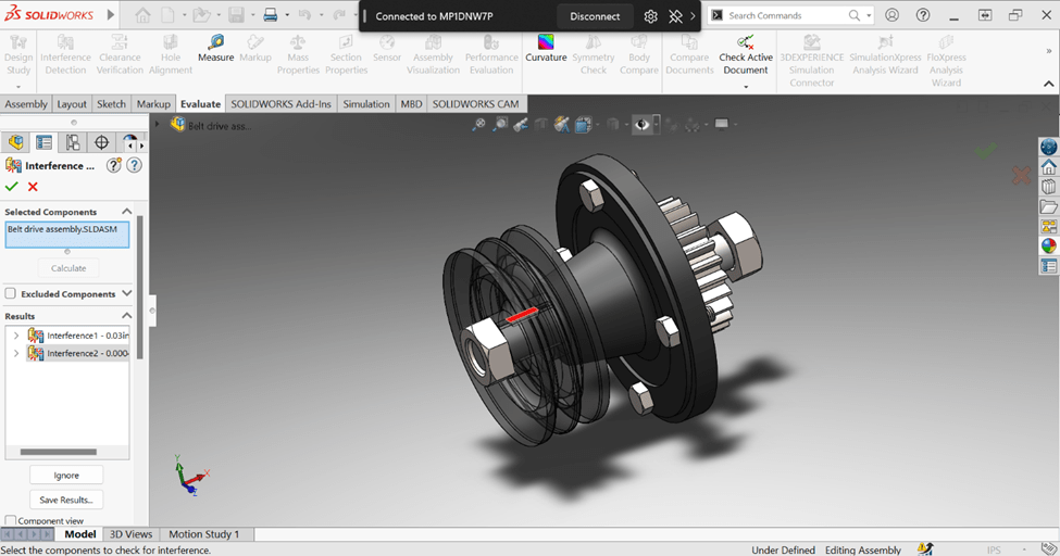 Two interferences were discovered during the analysis—both are the woodruff keys and the corresponding part around it (the pulley in the front and the spur gear in the back). These could have been fixed by adjusting the keyseat hubs on the pulley and the spur gear to the standard sizes from the given stables; because there are allowable tolerances, it would be good to adjust them within that range (in this case, closer to the maximum to allow for the most space).
