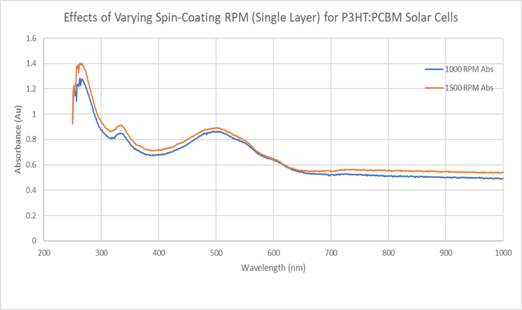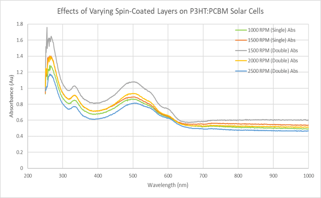 First, the data was able to demonstrate that the best speed to spin coat at is 1500 RPM. The reason being is because this speed is fast enough to spread the polymer all over the glass slide but not too fast so that it spreads too thinly. Through further testing, the effects of applying PEDOT onto the original solution of P3HT:PCBM was observed. PEDOT would increase the absorbance at wavelengths of 650-800 nm. Filtering and not filtering PEDOT also played a role on the outcome of the absorbance of the solar cell, as the filtered PEDOT would be able to achieve a better absorbance. This is due to the fact that filtering PEDOT decreases the chances of large particles to be drawn out of the solution and therefore a better more even spread is able to create. However, the results show that using PEDOT seems to reduce the peak of P3HT. Multiple layers were also spin coated; however, this reduced the absorbance rather than increase it as predicted. It may be due to the fact that spin coating another layer would push off some of the previous layer instead of adding to it. Finally, through repetition the best mixing time was determined to be a total of 65 hours. Although a lot of conclusions were made, there are still multiple parameters left to be tested and explained such as why PEDOT affects the peak of P3HT.